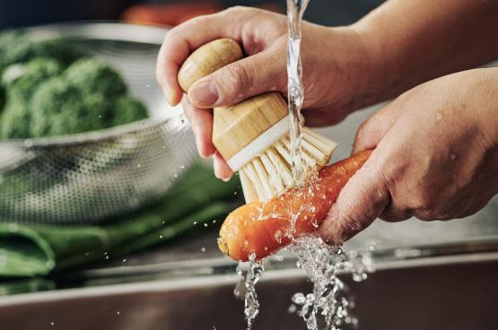 Rincez les légumes à l’eau courante fraîche. Frotter délicatement les légumes plus fermes avec une brosse à légumes.