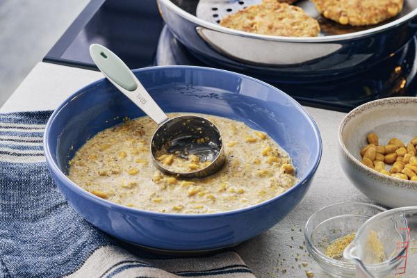 5. Préparer les galettes de maïs: Dans un petit bol, à l’aide d’un fouet, mélanger l’œuf, le lait et le maïs.
